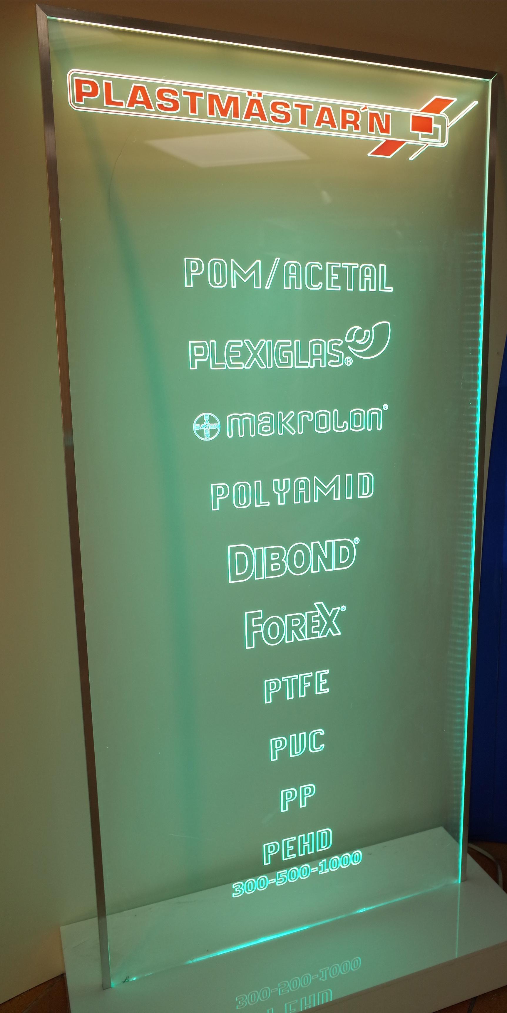 Plastmästarn AB är marknadsledande i Sverige när det kommer till att leverera ett varierat sortiment av plast till exponeringsprodukter för skylt, reklam och butiksinredning. Framför allt Plexiglas har fantastiska egenskaper och ett fördelaktigt utseende som passar perfekt för exponering. Basen i vårt sortiment utgörs av lättbearbetade halvfabrikat av Plexiglas i både extruderad och gjuten kvalitet. Vi framställer din reklamplast och det är bara din fantasi som sätter gränserna.